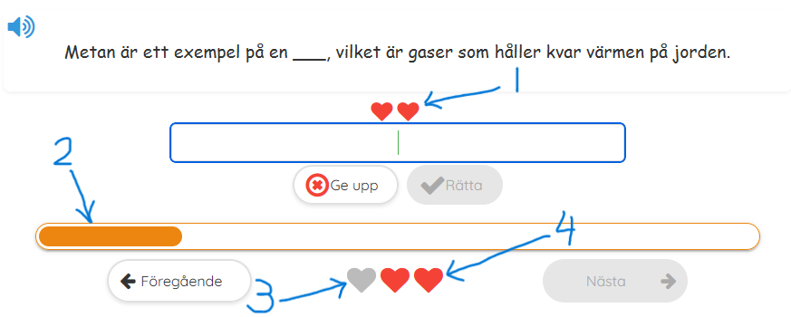 1. Eleven har två extra chanser att stava svaret korrekt. Dessa gäller enbart på denna uppgift. Det kommer 2 nya hjärtan på nästa uppgift.